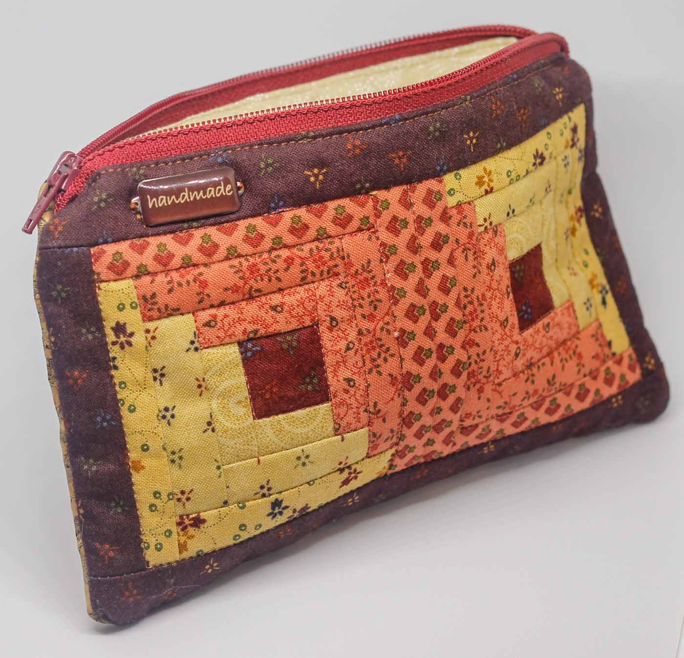 >Questo piccolo borsellino in particolare (ideale per portare le chiavi, la patente, il bancomat o un po’ di soldi per una spesa veloce) è arricchito dalla tecnica patchwork conosciuta come Log Cabin (la mia preferita). Quello che rende questo borsellino speciale sono proprio le dimensioni miniaturizzate dei Log Cabin. Basti considerare che i due quadratini bordeaux centrali misurano 2cmx2cm.